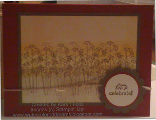All design, narrative and photographs on Watercolored Dreams are © Karen Foltz, Independent Stampin' Up! Demonstrator. The content of this blog is my sole responsibility as an independent Stampin' Up! demonstrator and the use of, content of, the classes, services, or products offered on this blog is not endorsed by Stampin' Up! Content shared on this site has not been posted for commercial purposes, and should not be used without written authorization. Please contact me for all publication usage requests.